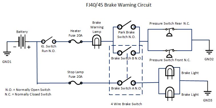 FYI! The correct brake light switch for this circuit is a 4 wire brake switch that contains TWO sets of normally OPEN contacts, A and B. The A set is for the actual brake lights and the B set is for the Low Brake Pressure Warning circuit. Be aware that a lot of aftermarket switches are only two wire and do NOT contain the B set of contacts! Make sure you have the correct switch installed.